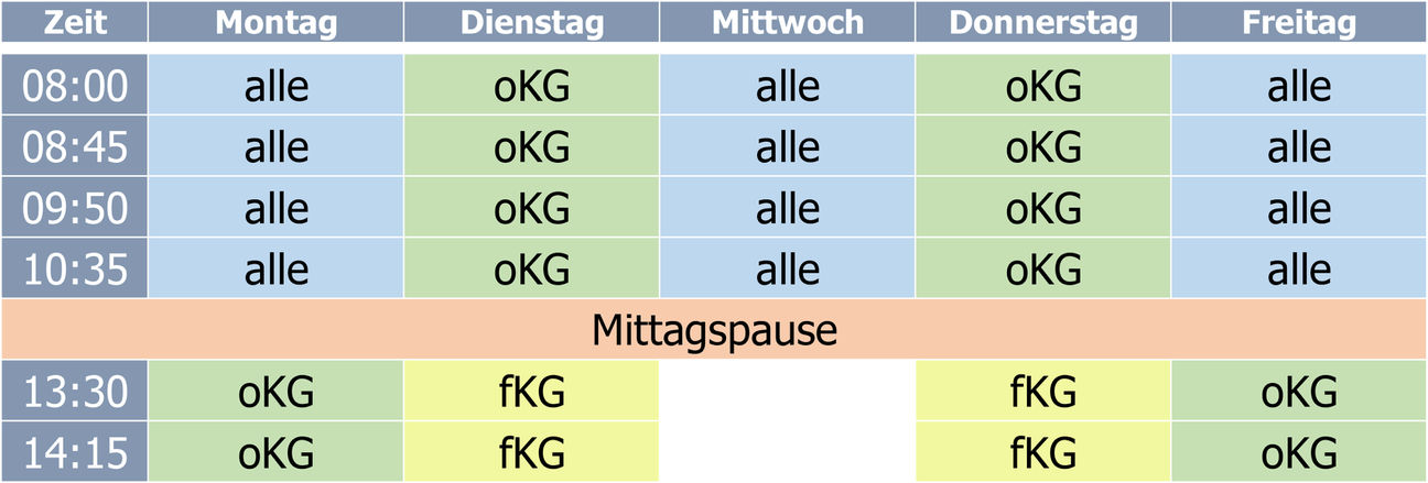 Im ersten Kindergartenjahr besuchen die Kinder den Unterricht während 16 Lektionen/Woche, im obligatorischen Kindergarten sind 24 Lektionen Pflicht.